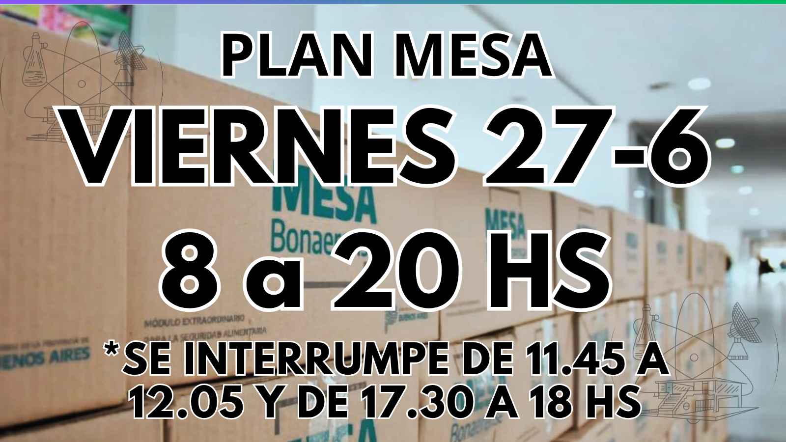 Se informa que la entrega de la caja MESA en el mes de junio se realizará UNICAMENTE el día VIERNES 27 DE JUNIO. La franja horaria será de 8 hs a 20 hs de forma corrida. Sólo se interrumpe la entrega de 11.45 hs a 12.05 hs, y de 17.30 hs a 18 hs para permitir el ingreso y el egreso de las y los estudiantes de diferentes turnos.