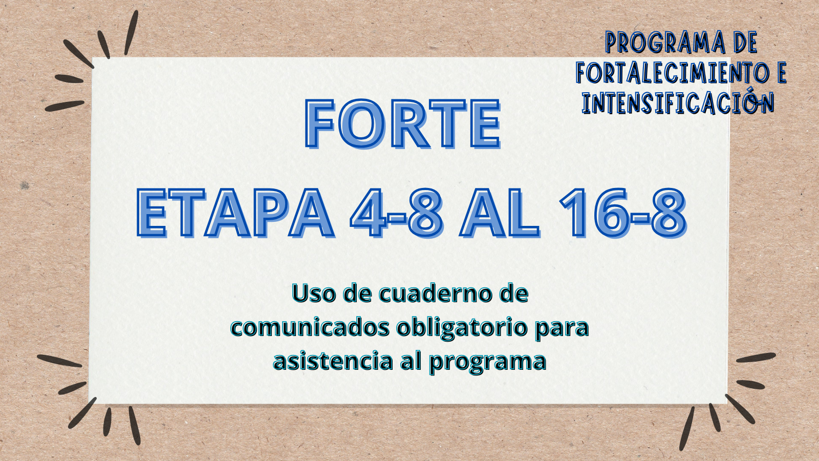 Aquellos que puedan concurrir a la intensificación Forte deberán traer el cuaderno de comunicados obligatoriamente, para detallar la asistencia al programa. Para la misma deberán comprar la planilla en el buffet de la escuela, o bien descargarla y traerla impresa. Es importante resaltar que al finalizar la actividad deberán retirarse del establecimiento.