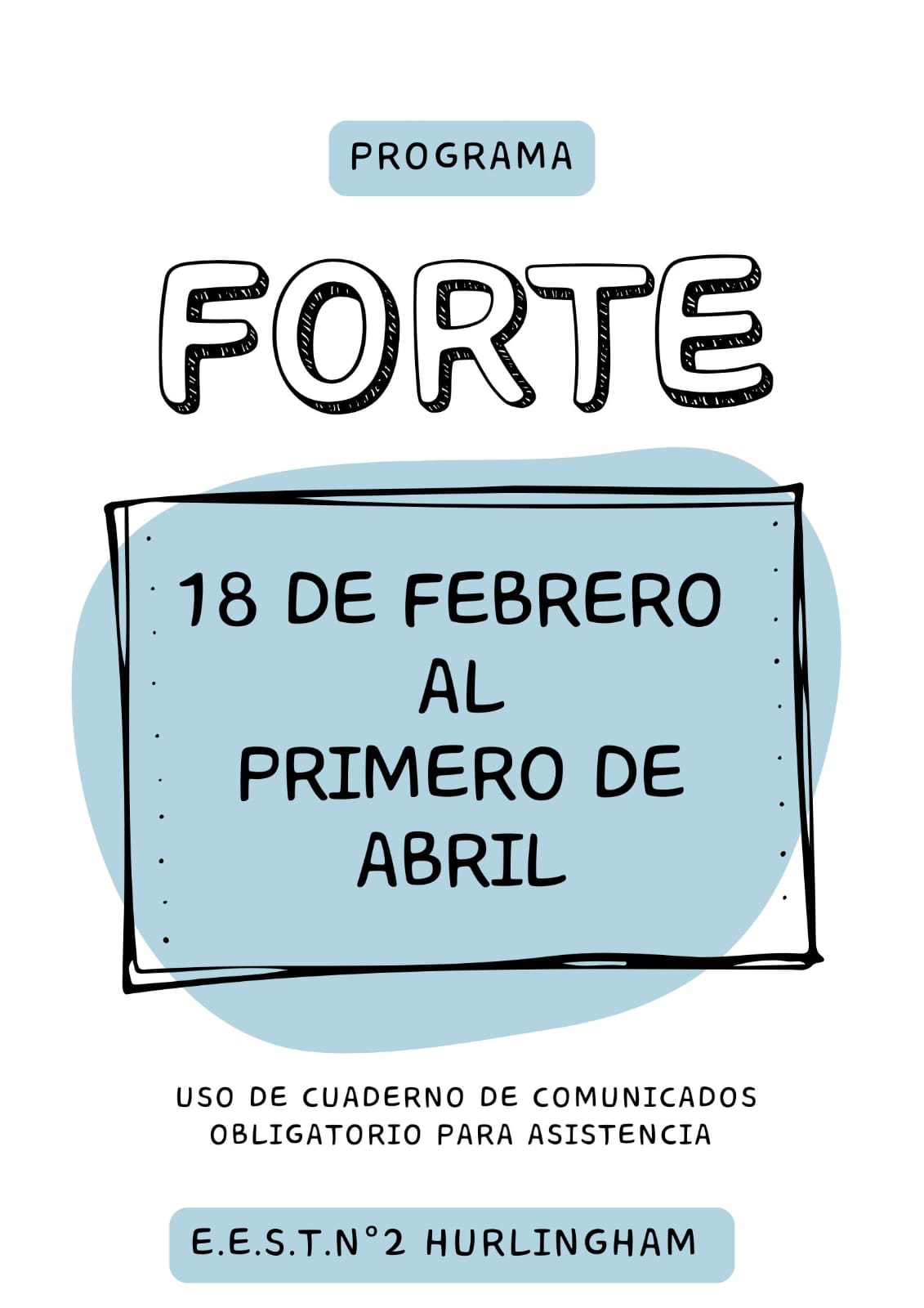 Aquellos que puedan concurrir a la intensificación Forte deberán traer el cuaderno de comunicados obligatoriamente, para detallar la asistencia al programa. Para la misma deberán comprar la planilla en el buffet de la escuela, o bien descargarla y traerla impresa. Es importante resaltar que al finalizar la actividad deberán retirarse del establecimiento y no pueden concurrir si coincide con su carga horaria de teoría o taller ya que las clases de la cursada tienen prioridad. Deberán traer los materiales necesarios para el desarrollo de las clases: hojas, biromes, reglas, tableros, etc.