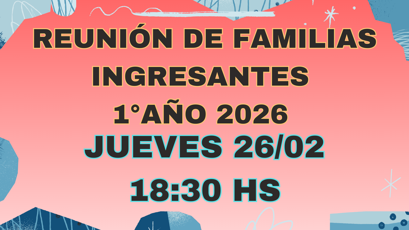 Tenemos el agrado de comunicarles que la reunión para los ingresantes a 1°año 2026 se realizará el día JUEVES 26/02 a las 18:30 hs.